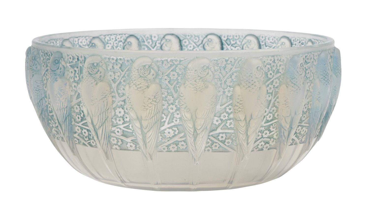 The body moulded with repeating parakeets within blossoming branches, in frosted, clear and opalescent glass, etched 'R. LALIQUE FRANCE' to base.