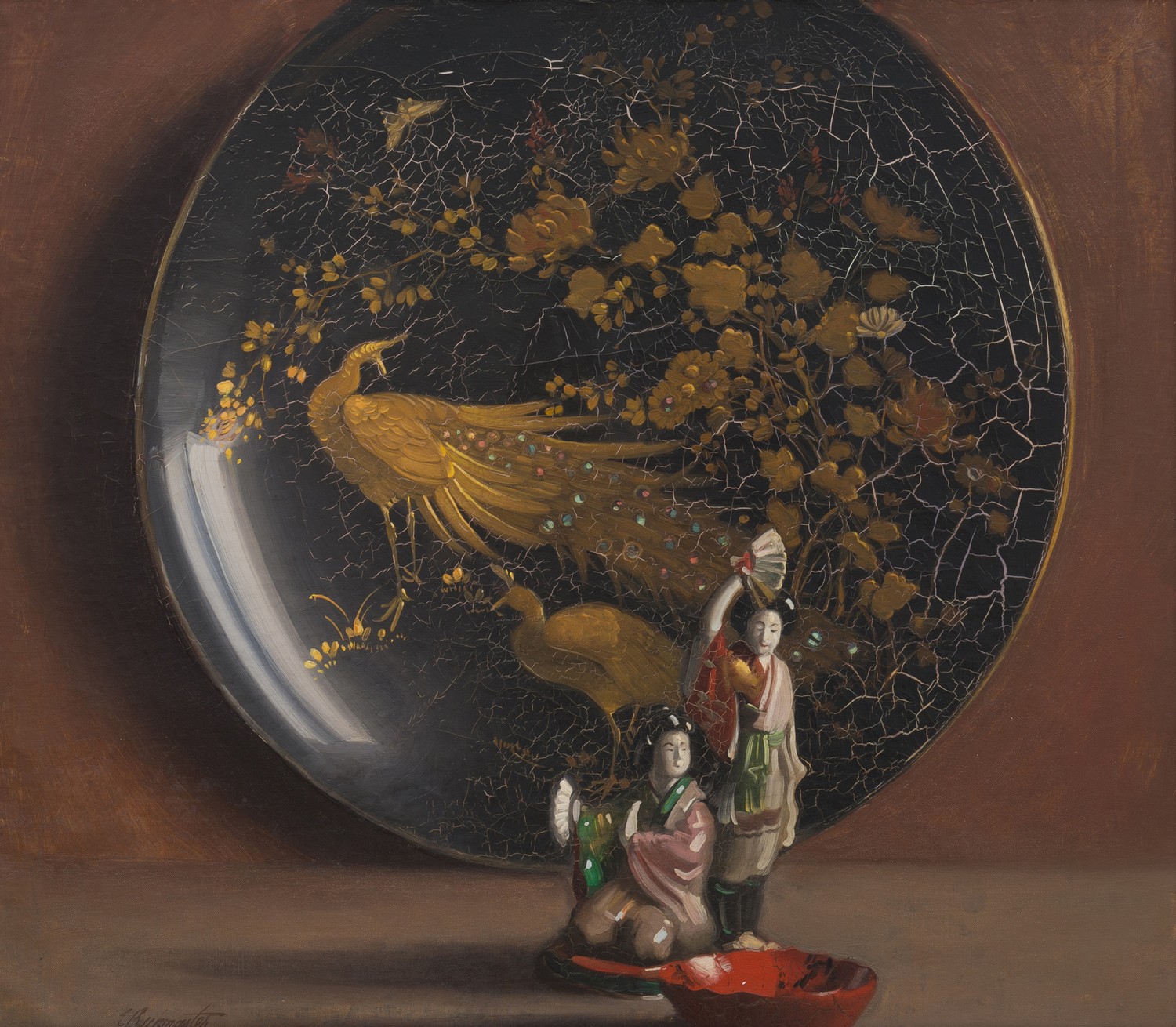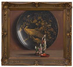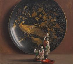 Significant splitting in the black paint (center area). Cracking is also present throughout. Paint loss in upper right center (pin-head sized). No apparent restoration work done to canvas. Possibly housed in the original frame, in very good condition.