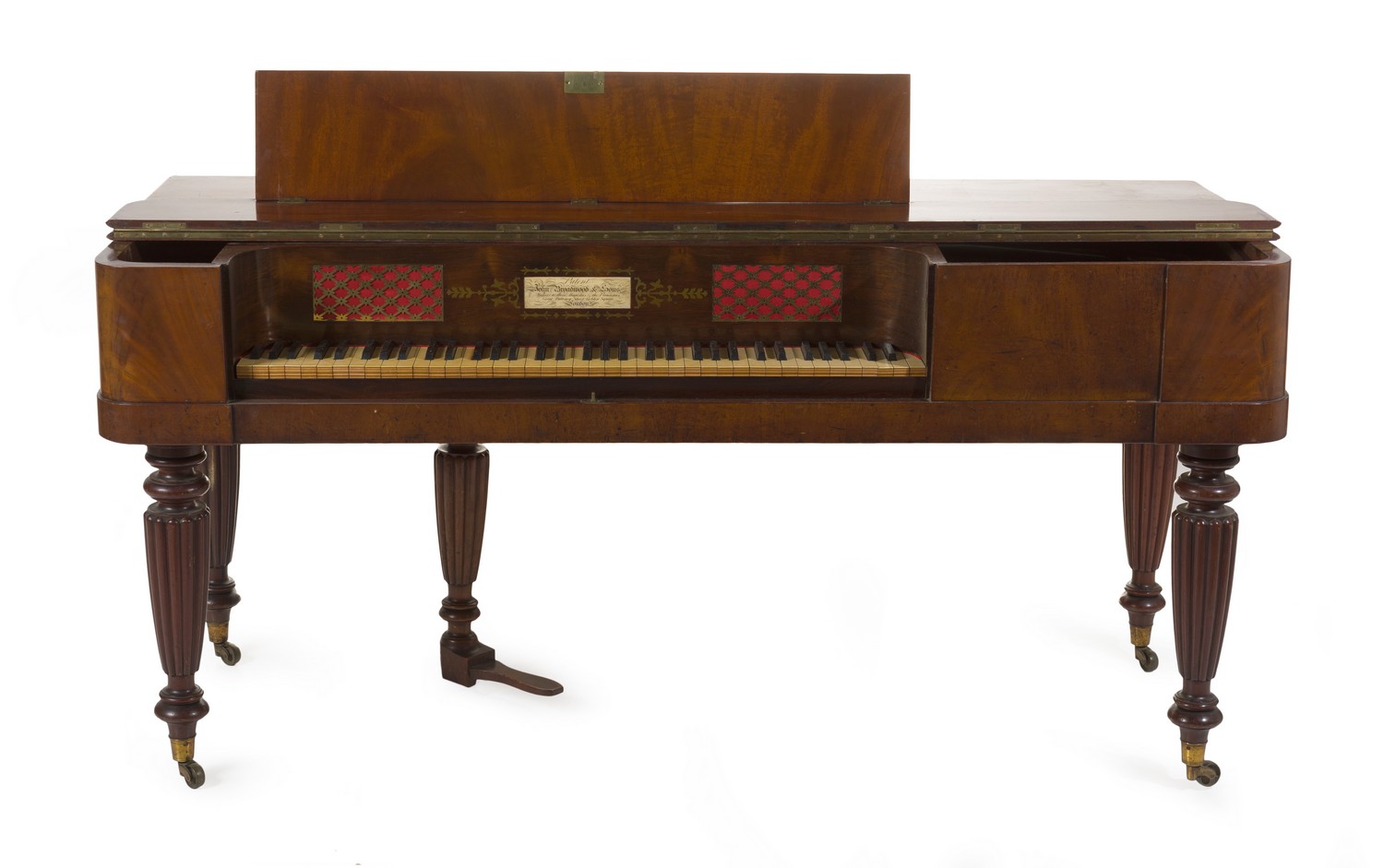 Rounded rectangular case in mahogany, comprising six octaves and a sustain pedal, decorated in cut brass inlay and fretting, raised on four fluted legs on castors .