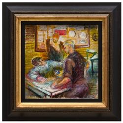Work is in very good condition overall, with colours strong and true to original form. Light blemished seen upper left hand side and one area upper right.  Paint thinning evident in corner edges (most particularly seen upper right corner).  Work is well framed.