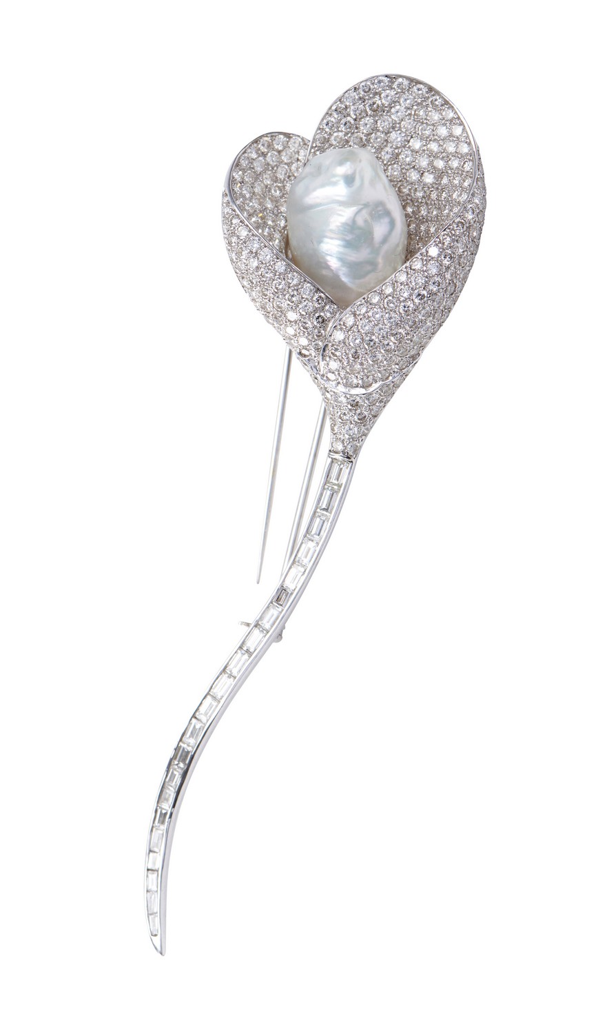 The floral form, featuring a keshi pearl of silver, white and pink hues, within pavé diamond set petals, to a stem set with baguette cut diamonds, altogether totalling 7.0cts, signed, in 18ct white gold, with accompanying Paspaley certificate and pouch.