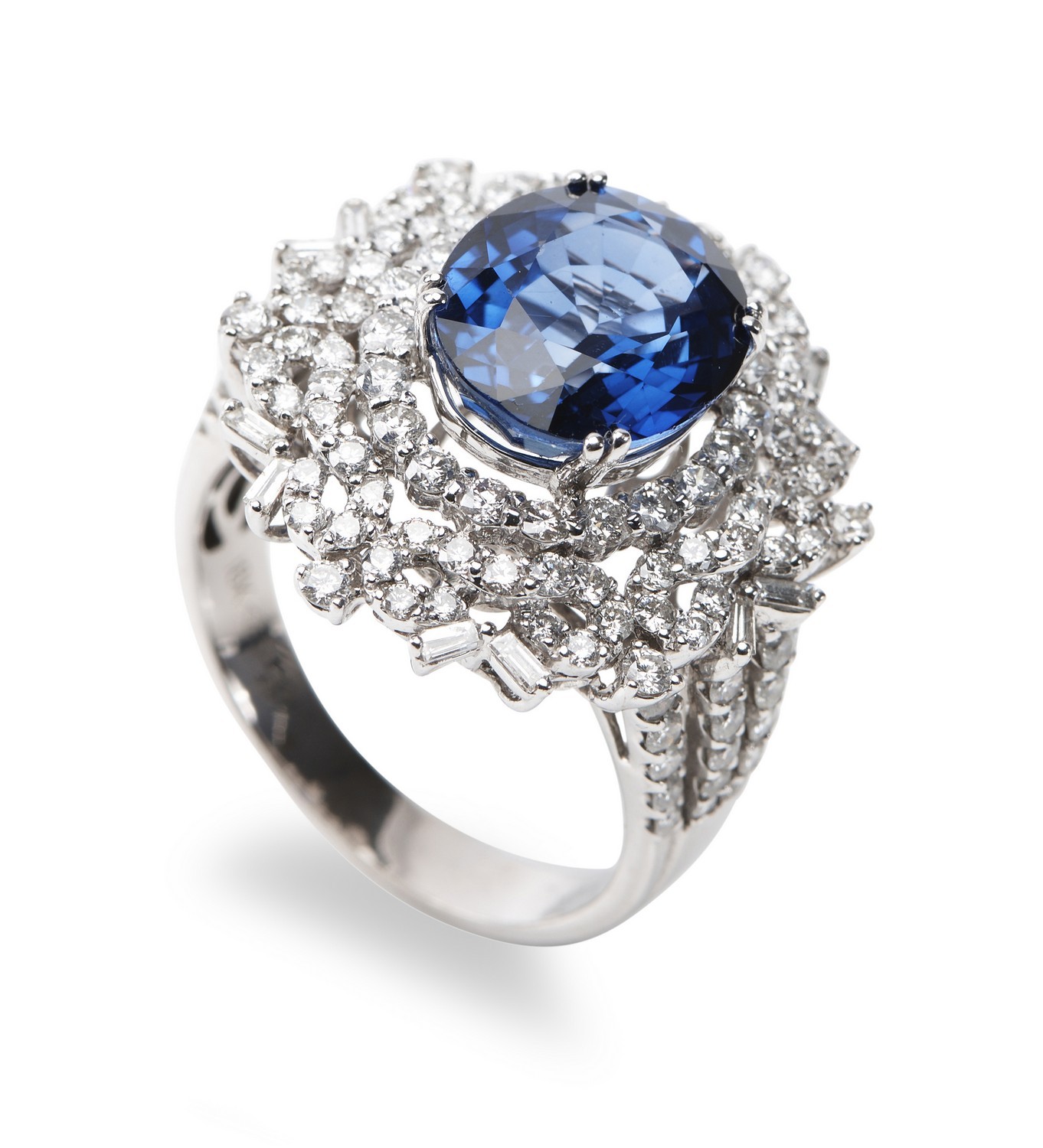 Of cluster design, centraly set with an oval sapphire weighing 7.0cts, surrounded and shouldered by baguette and round brilliant cut diamonds totalling 1.78cts, in 18ct white gold, ring size S.