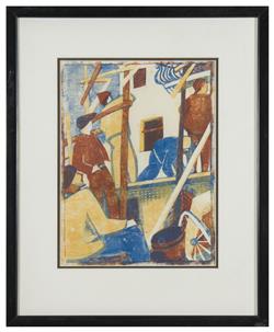 After seeing an exhibit of coloured linocuts by the Austrian artist Norbertine Bresslern-Roth, Lill was inspired to create her own. Her prints, however, were created from scenes of modern life - jazz bands, sports events, the London underground, and men at work.