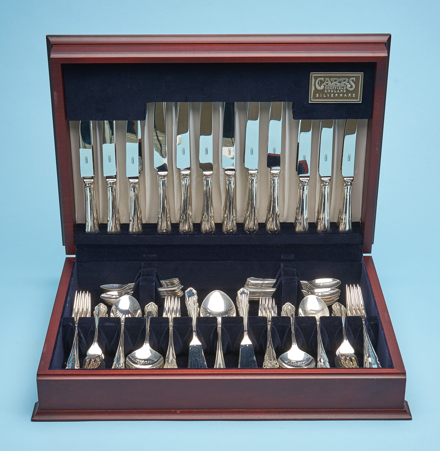 Comprising a setting for twelve. Accompanied by matching napkin rings and associated paperwork, and housed in fitted canteen.