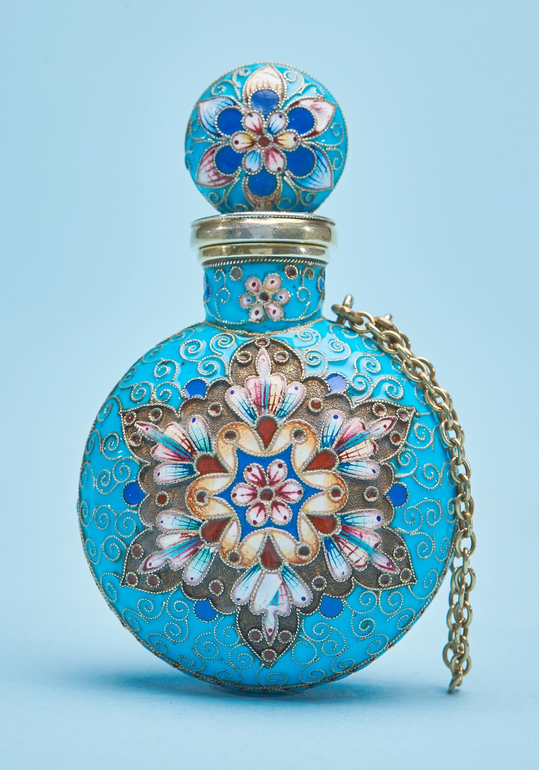 Of circular form, detailed with vibrant cloisonne enamel. Maker's marks for Ivan Khlebnikov, with a Russian silver 88 Zolotnik mark.