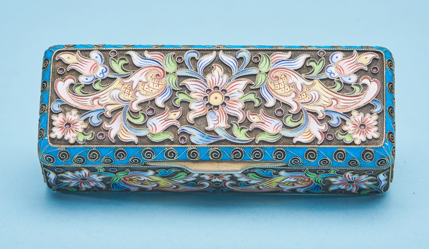 The small hinged rectangular case nicely decorated with vibrant cloisonne enamels in scrolling floriate motifs, the lid opening to a gilt wash interior. Maker's mark for Orest Kurlyukov, with a Russian silver 84 Zolotnik mark.