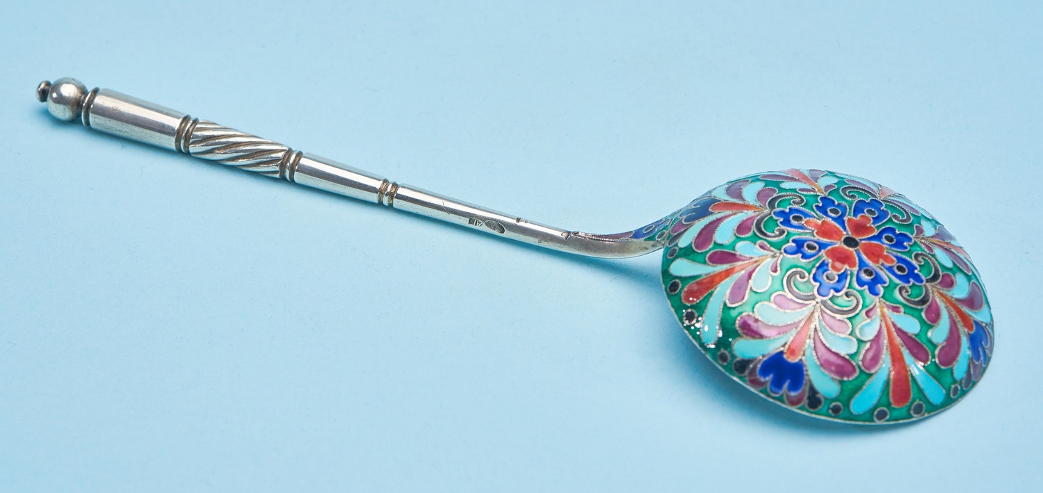 A LARGE RUSSIAN SILVER & CLOISONNE SPOON