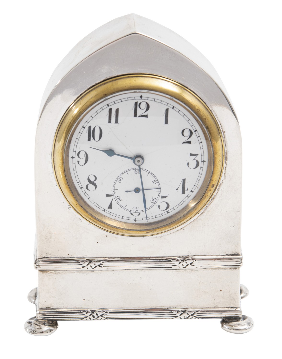 The domed case raised on four bun feet, inset with a circular enamel dial with a smaller subsidiary seconds dial.