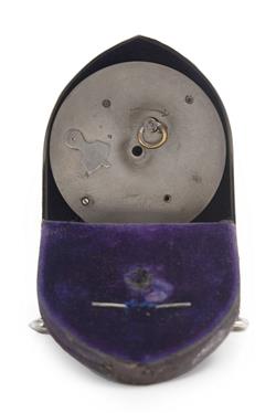 Not recently timed or serviced, the enamel dial has numerous hair line cracks, light surface scratches and some dents to the case, the bun feet are dented, the back canvas panel appears to have been re painted.