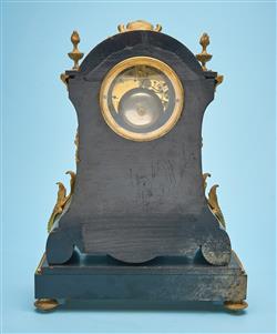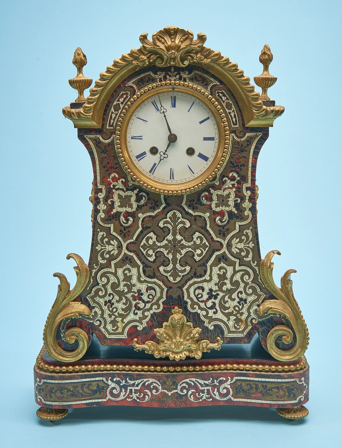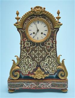 With silk suspension, 30 day bell strike, having an arched ormolu top flanked by torch finials, the enameled clock face with blue Roman numerals, the front of the case and stand inlaid with cut brass, tortoise shell and bone, and applied with ormolu mounts.