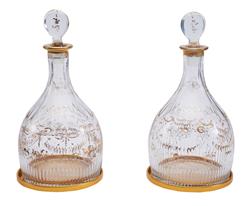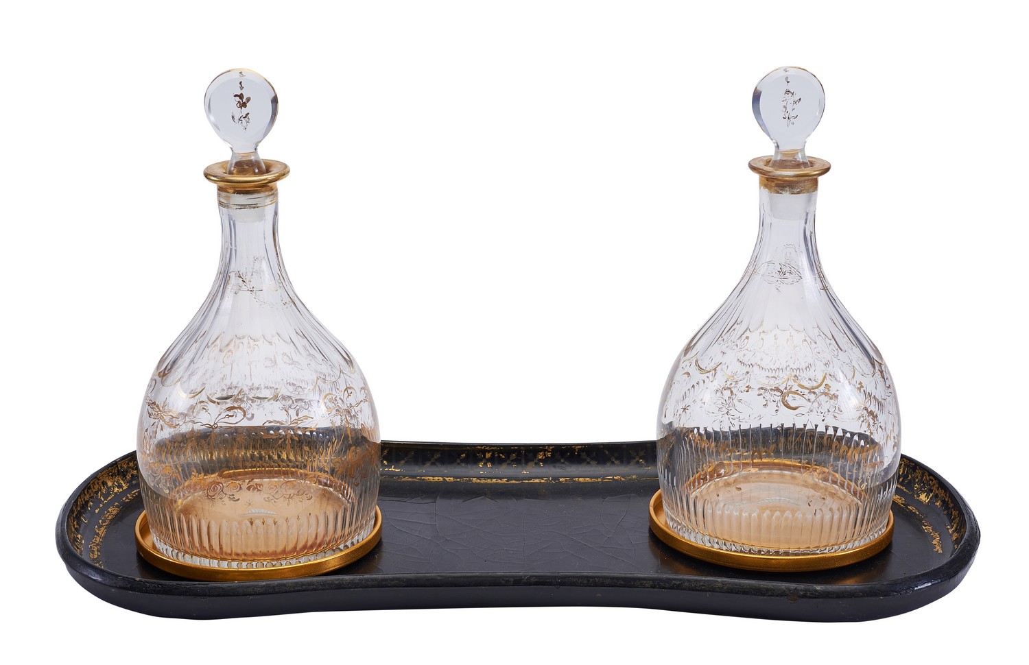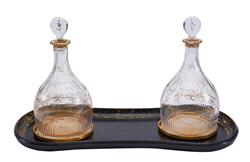 Both stoppers have very minor chips, the gilded decoration has both small losses and rubbing, noticable residue in one decanter. Condition of the tray is consistent with age having crazing to the lacquer and rubbing to the gilding.