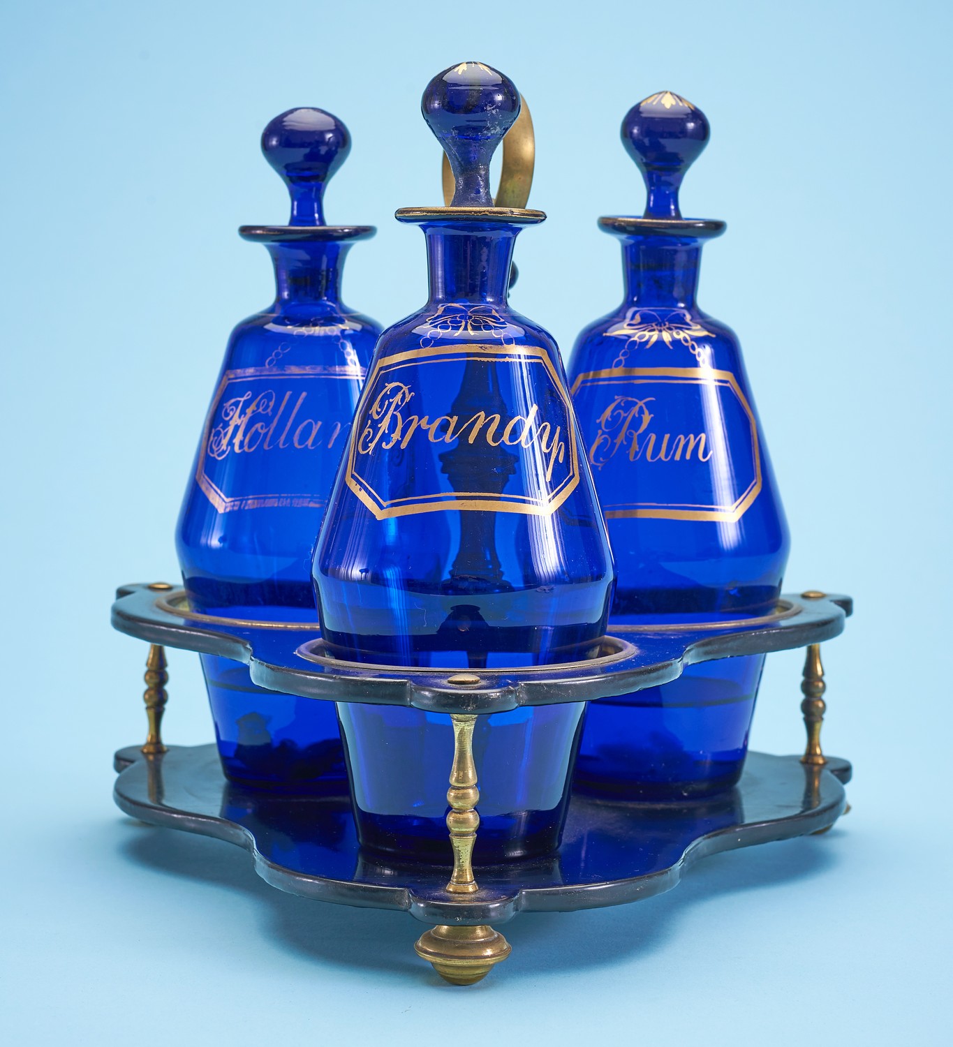 The three decanters gilded with labels for Hollands (Gin), Rum, and Brandy in gold. The stand having circular brass handle, turned supports, and raised on three brass feet