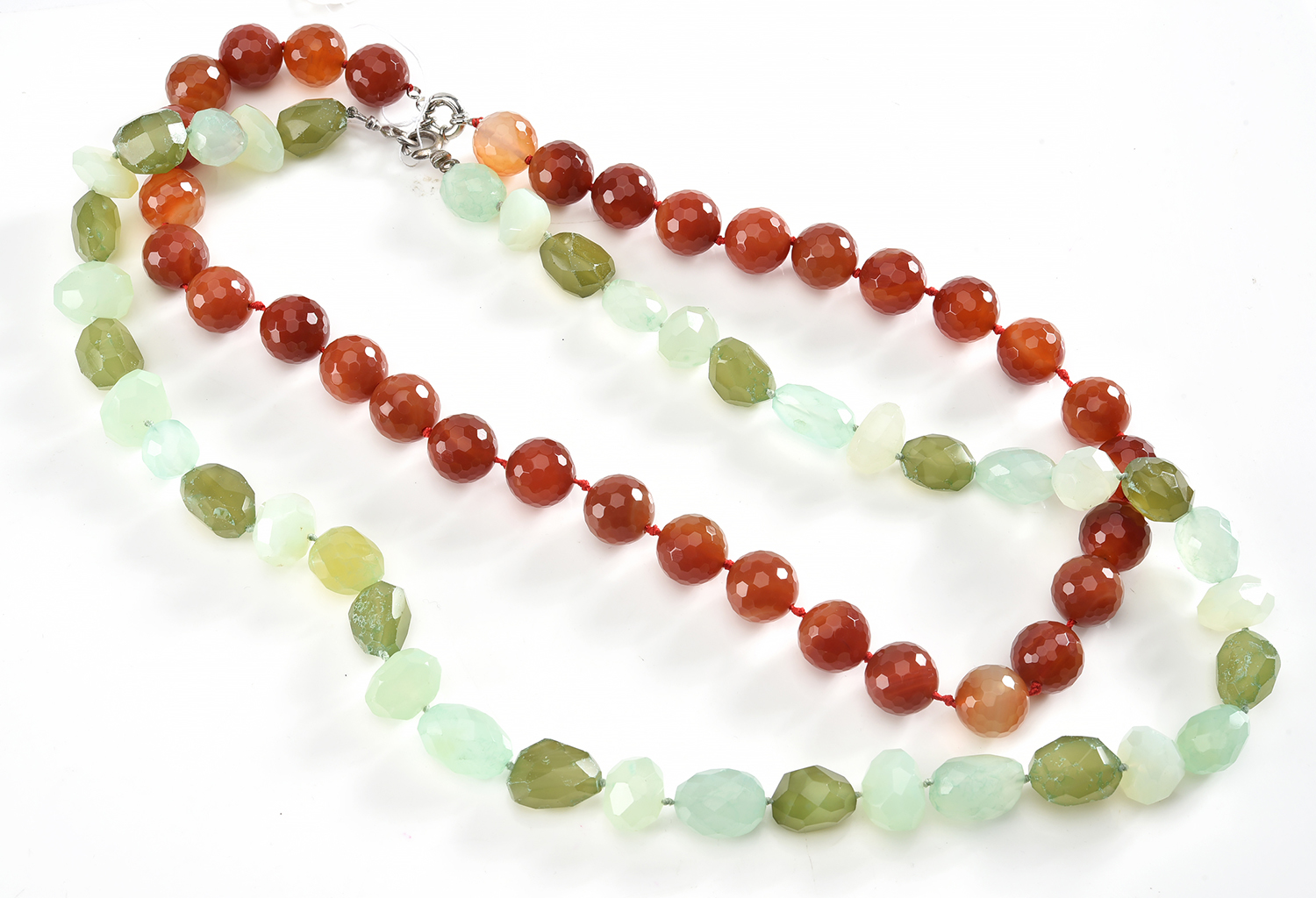 A STRAND OF CHRYSOPRASE BEAD(TOTAL LENGTH 810MM) AND CARNELIAN BEAD (TOTAL LENGTH 700MM) NECKLACES, BOTH TO SILVER CLASPS
