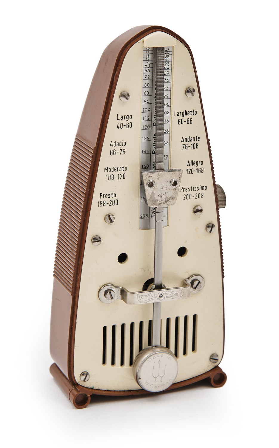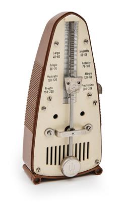 The baton mounted with a sterling silver top, hallmarked London, John George Smith, circa 1887. The West German metronome in two-tone plastic casing, made by Wittner Prazision.