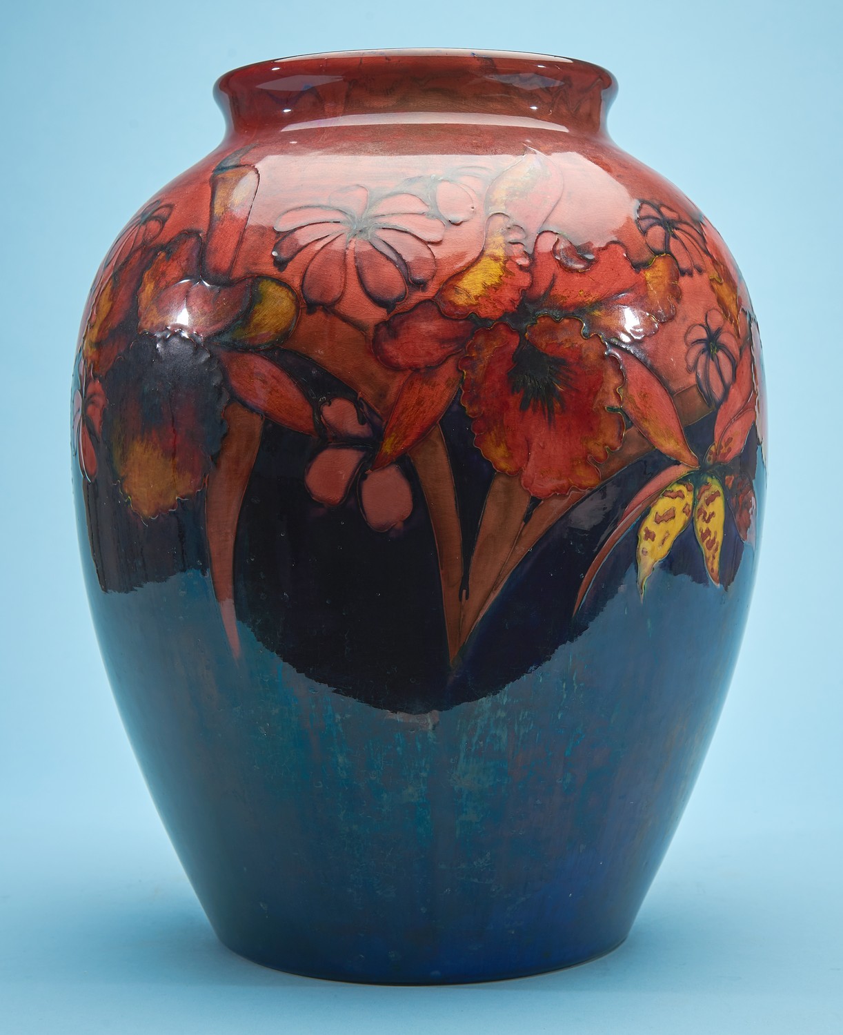 Decorated with a band of large flower heads and spring flowers on a graduated flambe and deep blue ground. Signed in blue 'W. Moorcroft' and dated '1939', with impressed facsimile signature and 'Potter to H.M. the Queen, Made in England' stamped to base.