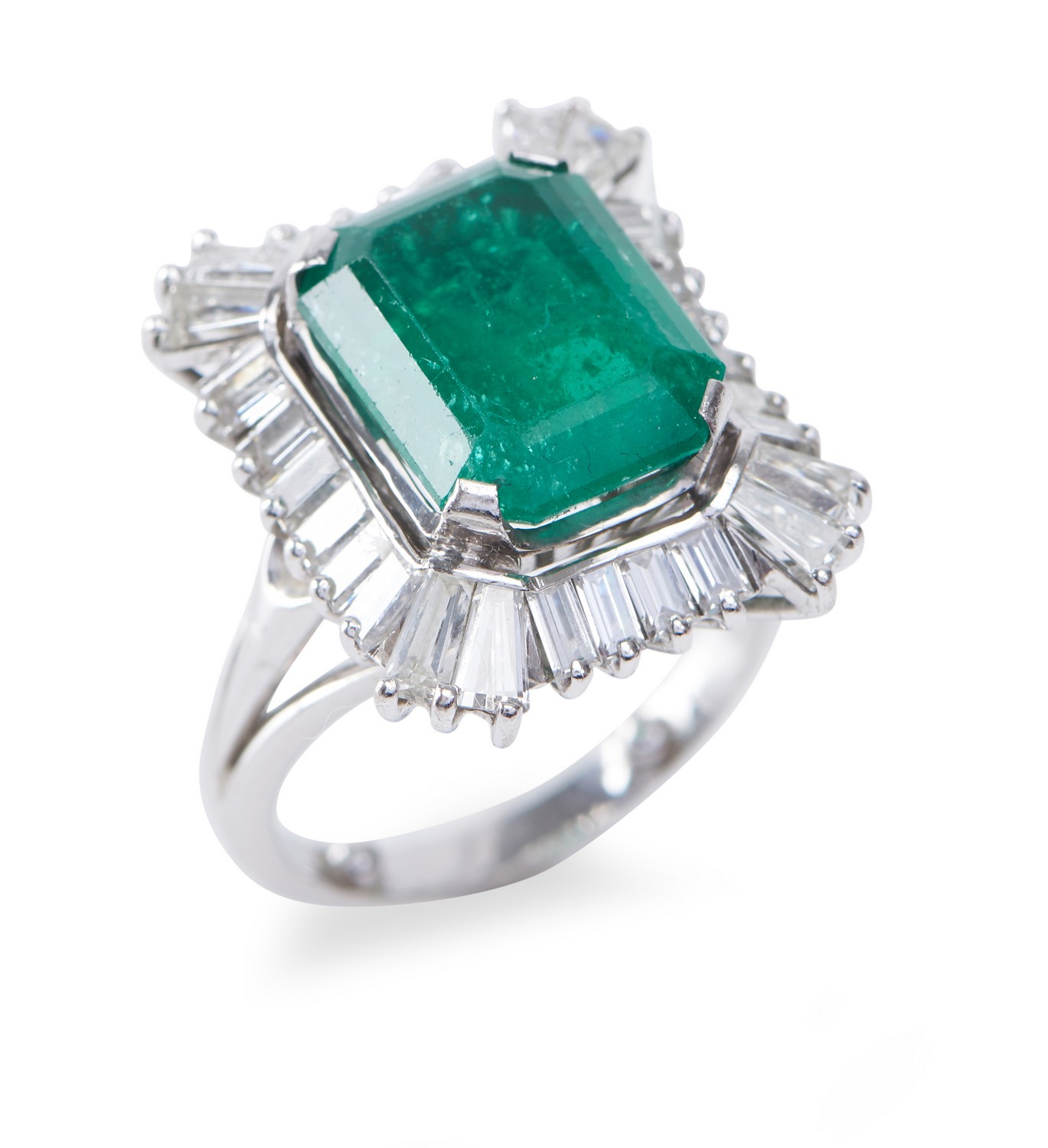 The emerald cut emerald of 6.70cts surrounded by twenty eight baguette and tapered baguette cut diamonds, in 18ct white gold, ring size K 1/2.