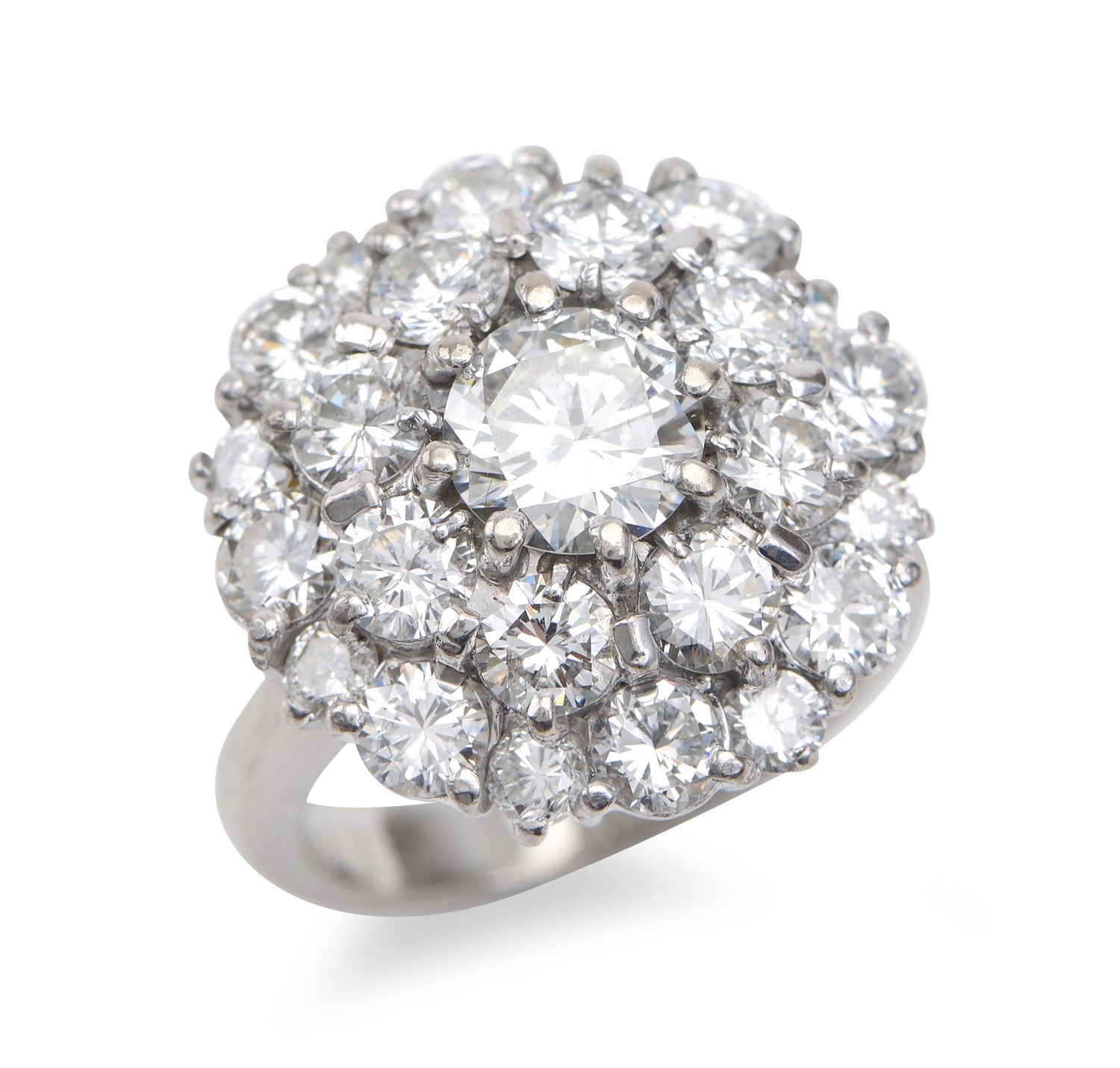 Centrally set with a round brilliant cut diamond weighing an estimated 1.25cts, in a surround of twenty four further diamonds totalling 3.56cts, in platinum, ring size L.