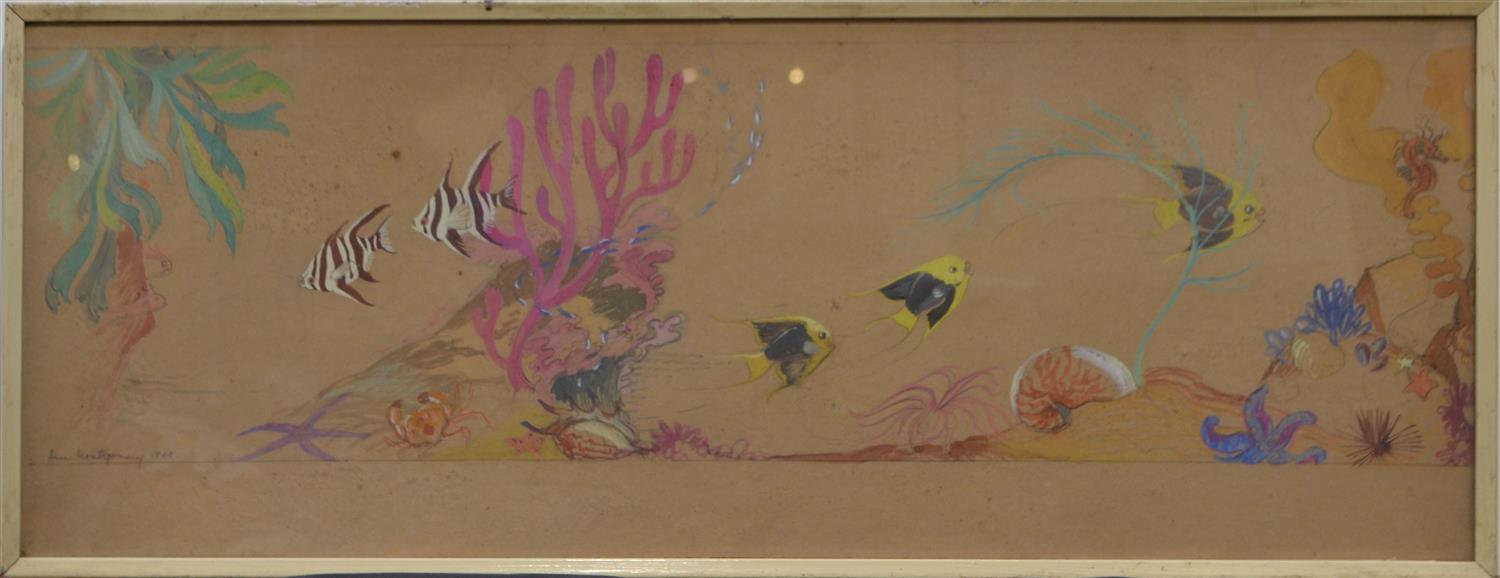 ANNE MONTGOMERY, FISH 1944, GOUACHE ON CARD, 26 X 70CM, FRAME SIZE: 28 X 72CM, CONDITION: FOXING AND DISCOLOURATION THROUGHOUT, FRAME SIZE: 28 X 72CM