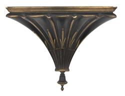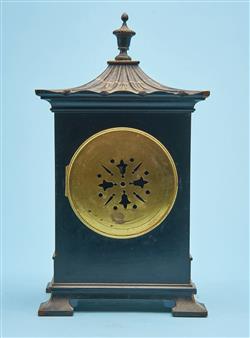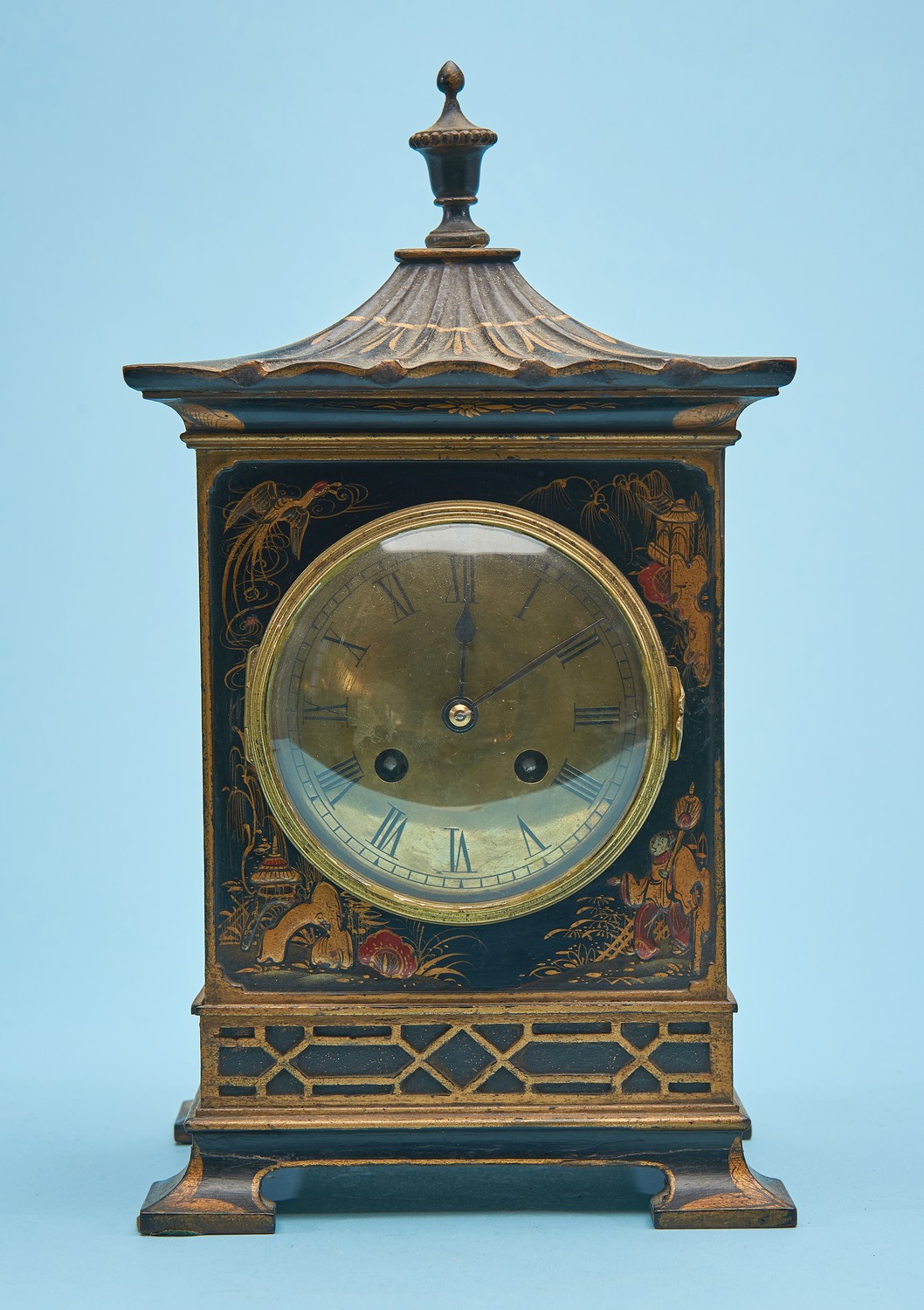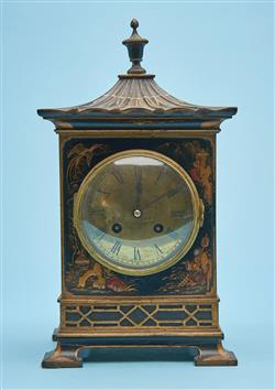 With a French movement, key and pendulum, having a pagoda pediment and a japanned case with landscapes, figures, and birds, raised on bracket feet, and accompanied by a matching wall bracket.