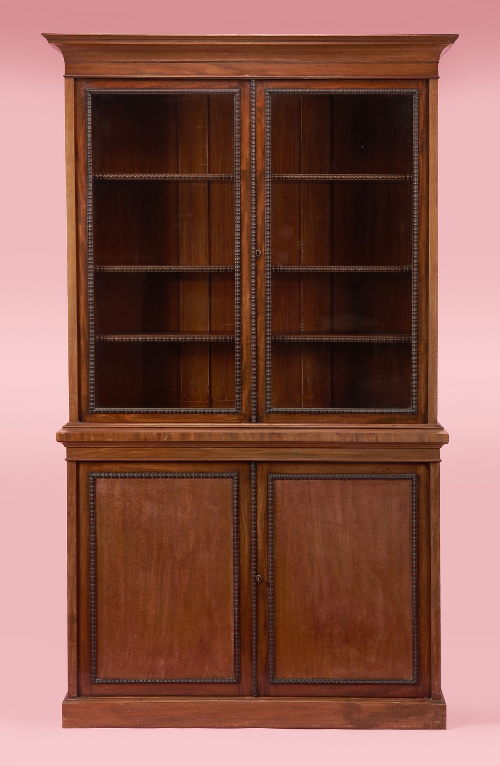 The moulded cornice above glazed doors enclosing shelves, and two doors to the cabinet below, all bordered with beading