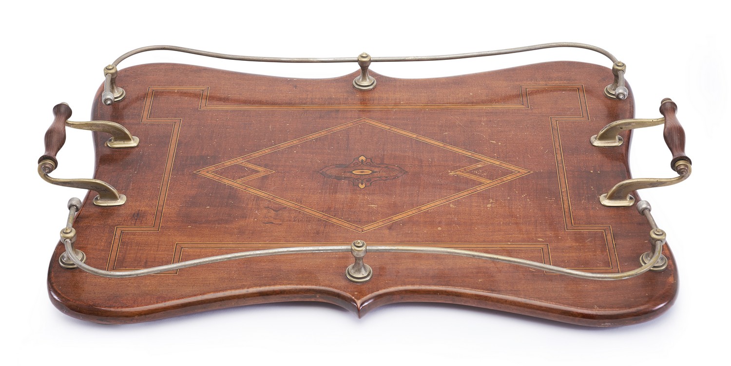 Of serpentine form with a brassed gallery and handles, marquetry inlaid, raised on ten bun feet