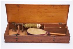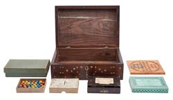 Comprising a wooden cased 'Bussey's Table Tennis' set, containing two vellum paddles, a net with 'G' clamps, and three balls, and a 19th century Indian box containing games including Polish Bezique, boxed checkers, and cards