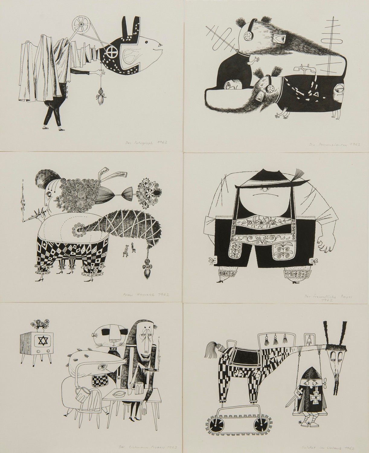 i. Der Fotograph (The Photographer) ii. Der Freundliche Bayer (The Friendly Bavarian) iii. Die Denunzianten (The Denouncers) iv. Frau Neureich (New Money Woman) v. Der Eichmann Prozess (The Eichmann Process) vi. Soldat im Urlaub (Soldier on Vacation)