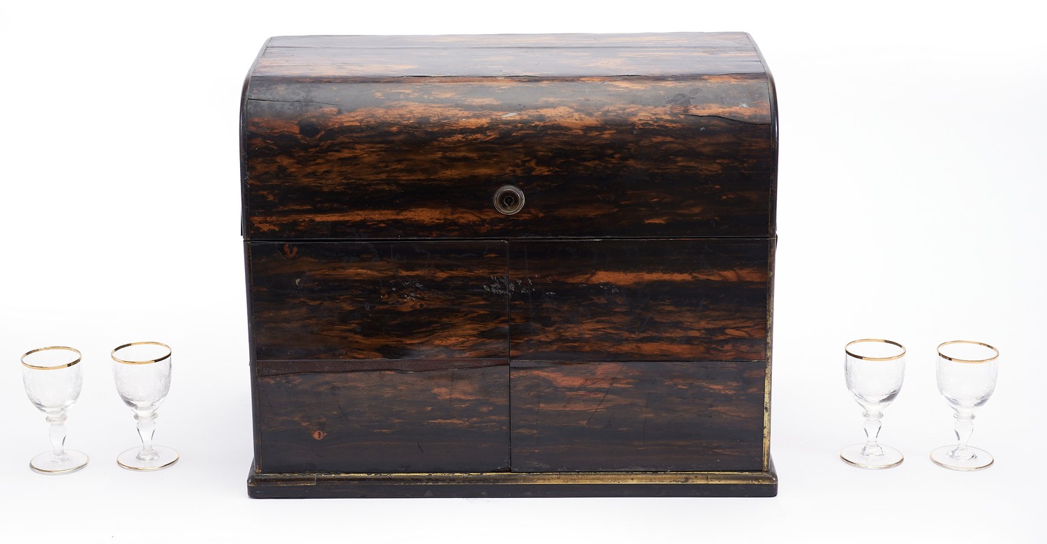The dome hinged top with two hinged front doors enclosing a fitted satinwood interior with twenty liqueur glasses (not original)