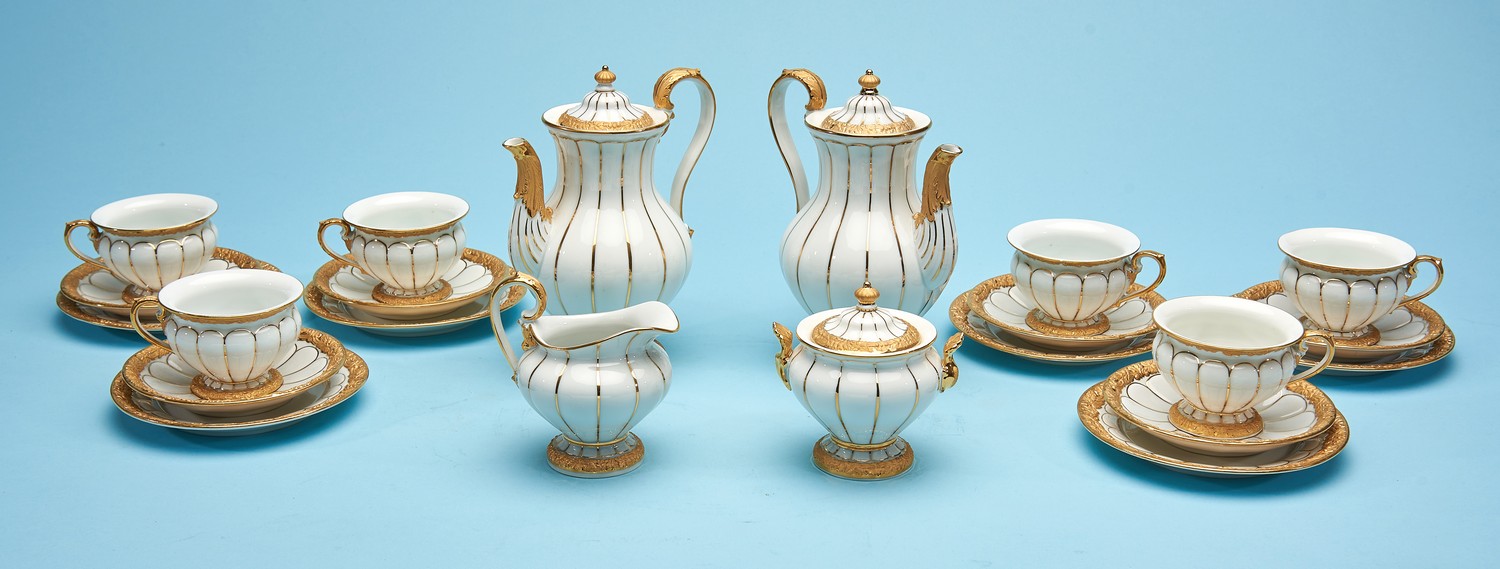 Of fluted form and raised gilding throughout. Comprising two matching coffee pots, six demi tasse, saucers, and under plates, a sugar pot and creamer. Crossed swords to the bases.