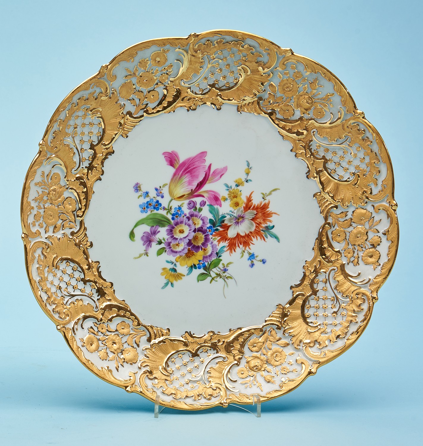 The centre with painted flowers, surrounded by a repeated band of gilded flowers, lattices, and scrolls. Crossed swords to verso.
