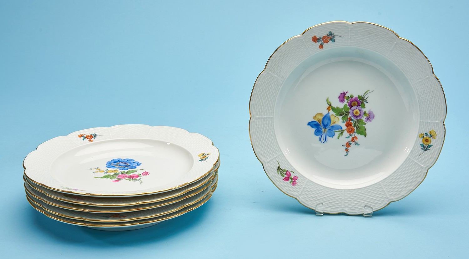 The centre with painted flowers and three painted flowers on top of the moulded basket weave pattern border. Crossed swords to verso, pattern no. 460 over 20 on all six.