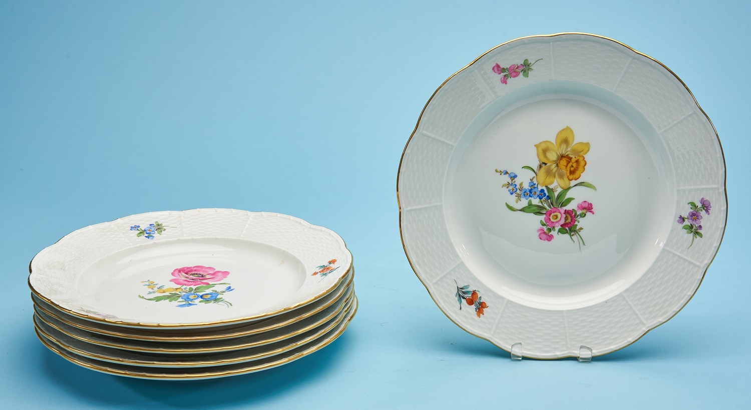 The central painted floral bouquet with three painted flowers on moulded basket weave pattern border. Crossed swords to verso, pattern numbers 460 over 30.
