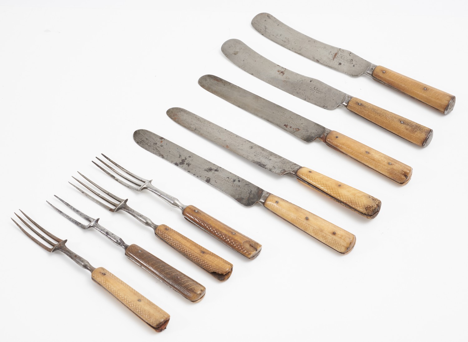 Comprising thirteen three-pronged forks and nine steel bladed knive