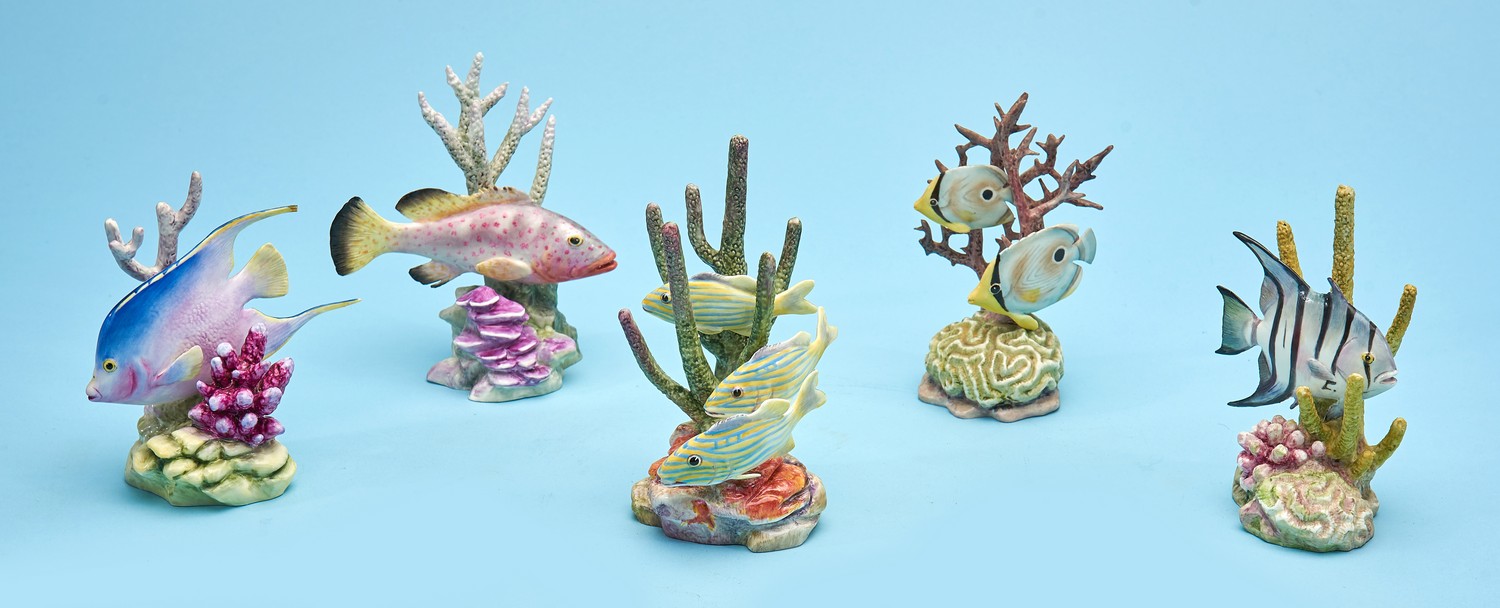 Comprising 'Blue Angel', 'Red Hind', 'Yellow Grunt', 'Spade Fish' & 'Four Eyed Fish'. Factory marks and model numbers to each base.