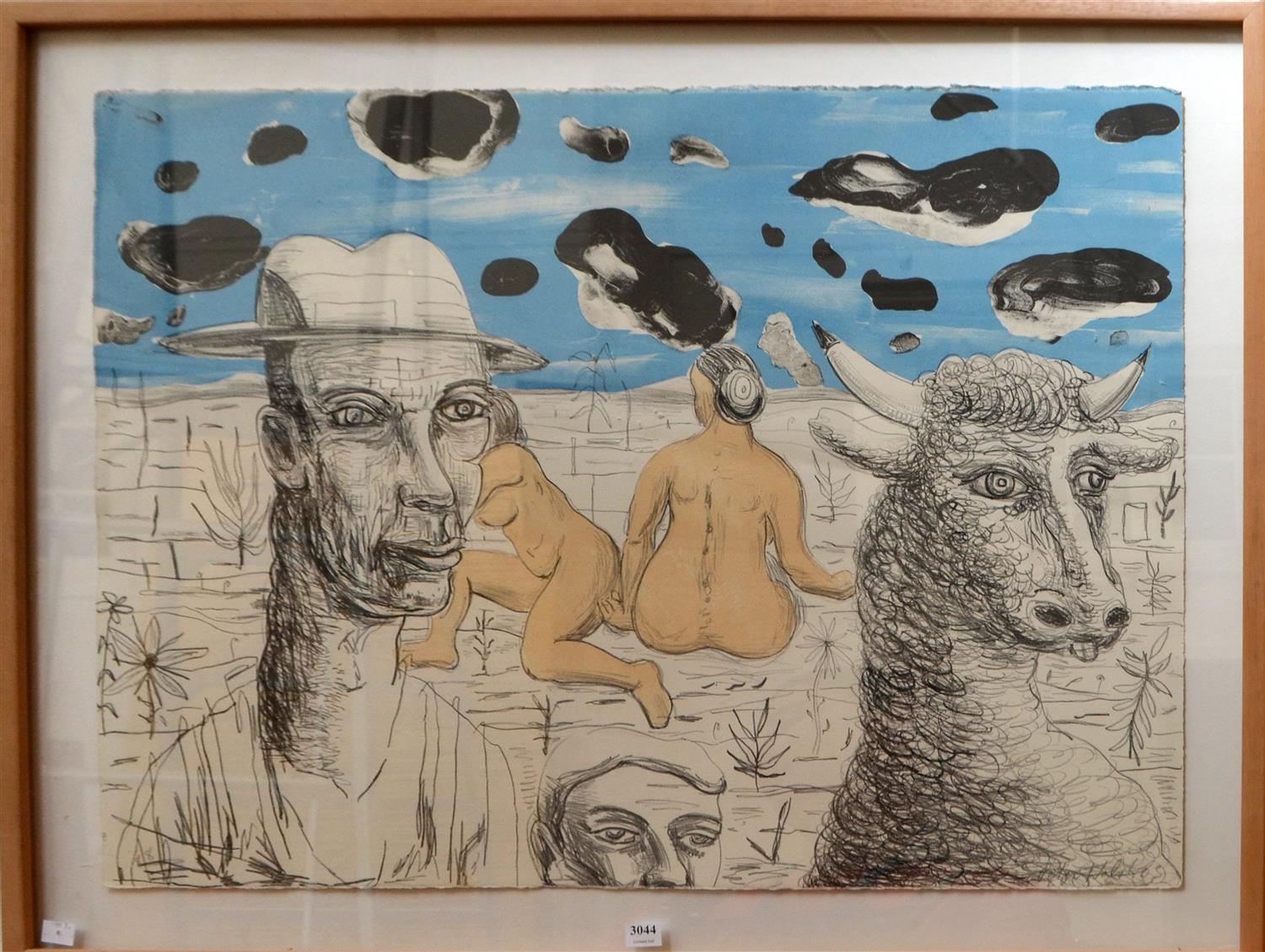 PETER WALSH, UNTITLED, MIXED MEDIA ON PAPER, IMAGE SIZE: 56 X 75CM, CONDITION: GOOD CONDITION OVERALL, PAPER DISPLAYS NATURAL INCONSITENCIES IN TEXTURE, SO THE PRINTED IMAGE HAS NOT TRANSFERRED SMOOTHLY OVER THESE AREAS. FRAME IS IN FAIR CONDITION. FRAME SIZE: 69 X 88.5CM