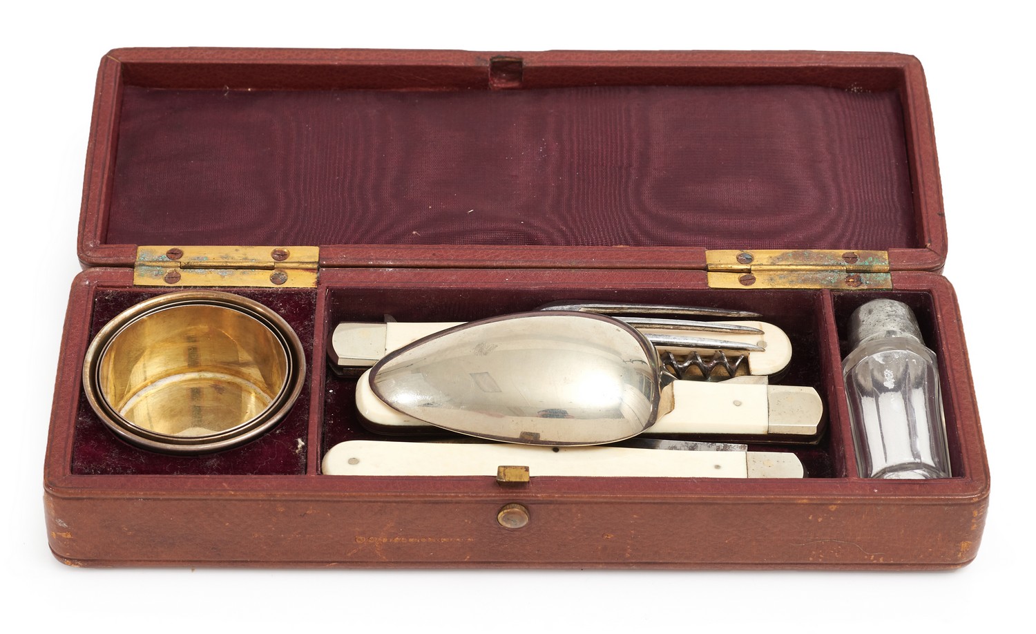 The leather case monogramed and dated 1st July 1872 to lid. Opening to reveal a retractable travelling cup, small salt shaker, and three piece ivory and silver plate folding knife, spoon, fork and cork screw.