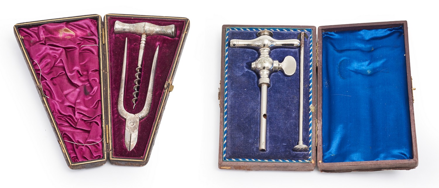 Comprising a boxed French champagne tap, bearing a paper to the base 'Champagne on tap/ The cheesetaste tap' with directions, and a 19th century engraved steel cork screw and pliers set with case.