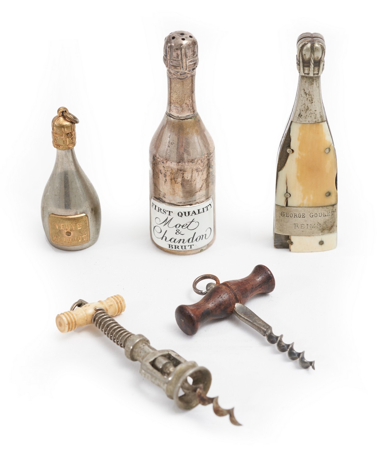 Comprising eight pocket corkscrews, a 'Veuve Cliquot' champagne bottle-shaped measuring tape, a 'Moet & Chandon' champagne bottle shaped salt shaker and a 'George Goulet Reims' champagne bottle shaped pocket knife.