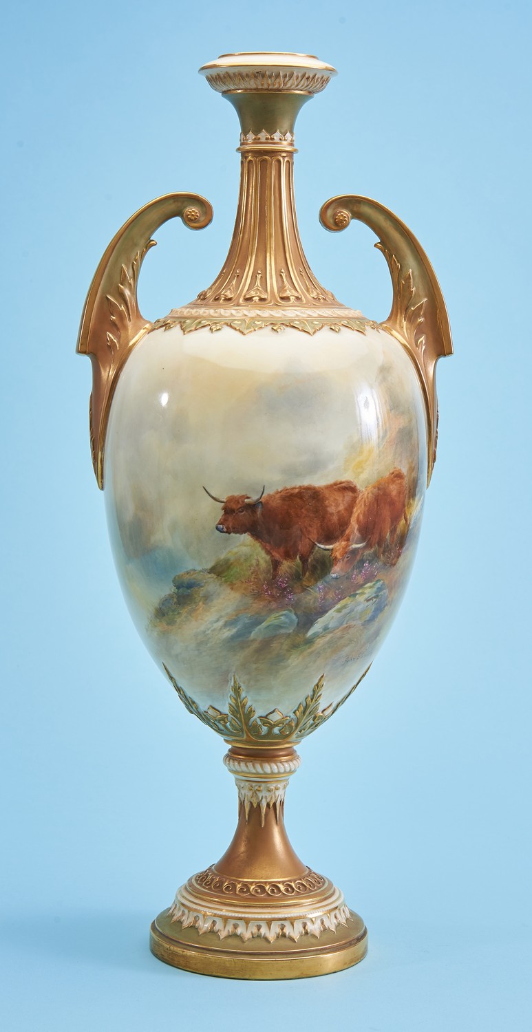 Ovoid in form, with scrolled handles, raised on a flared circular base, with painted highland cattle, signed 'John Stinton' below. Puce factory mark to base.
