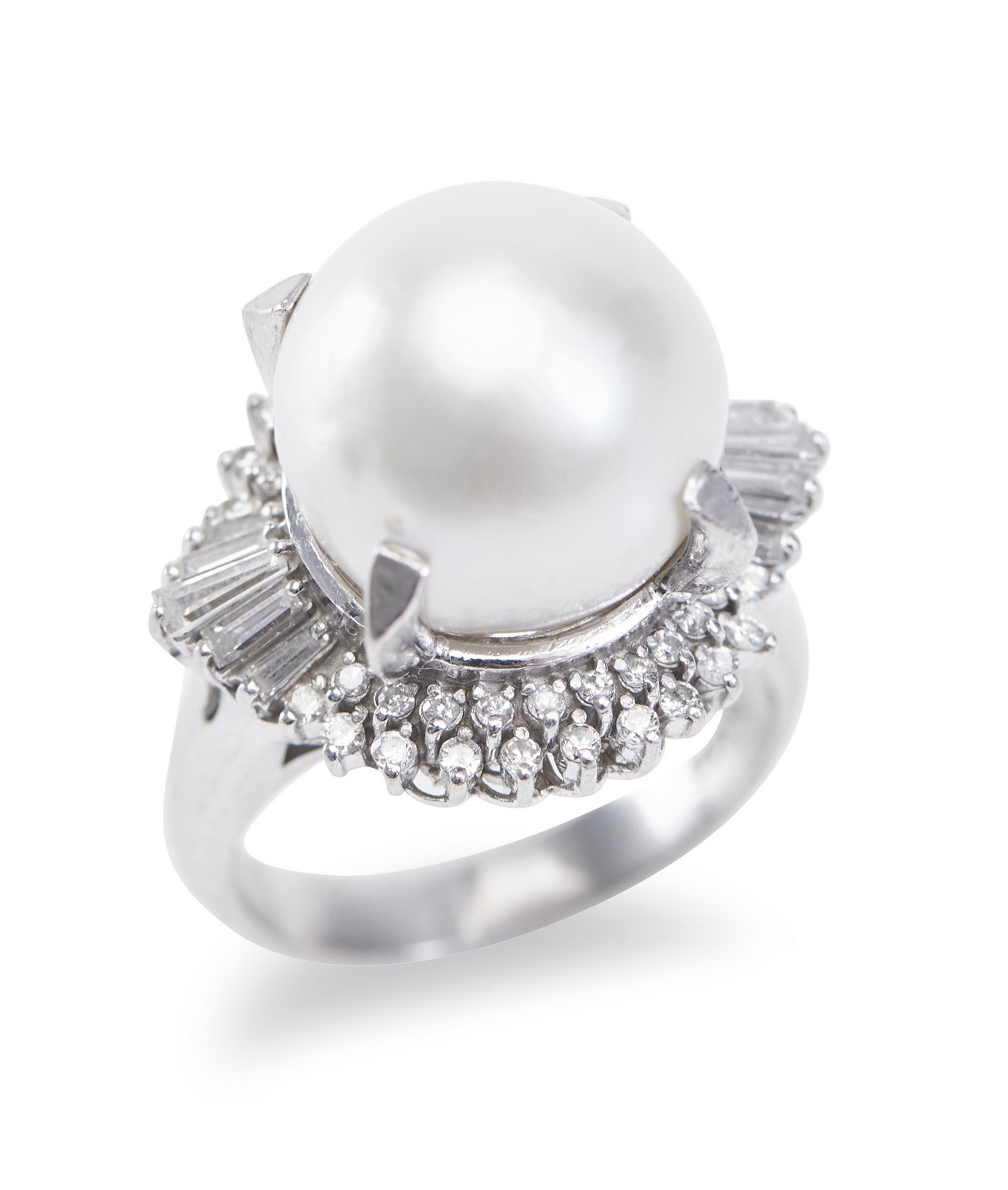 Featuring an undrilled pearl of silver white hues, measuring 12.6mm, within an undulating border of round brilliant and tapered baguette cut diamonds totalling 0.56cts, in platinum, ring size K.