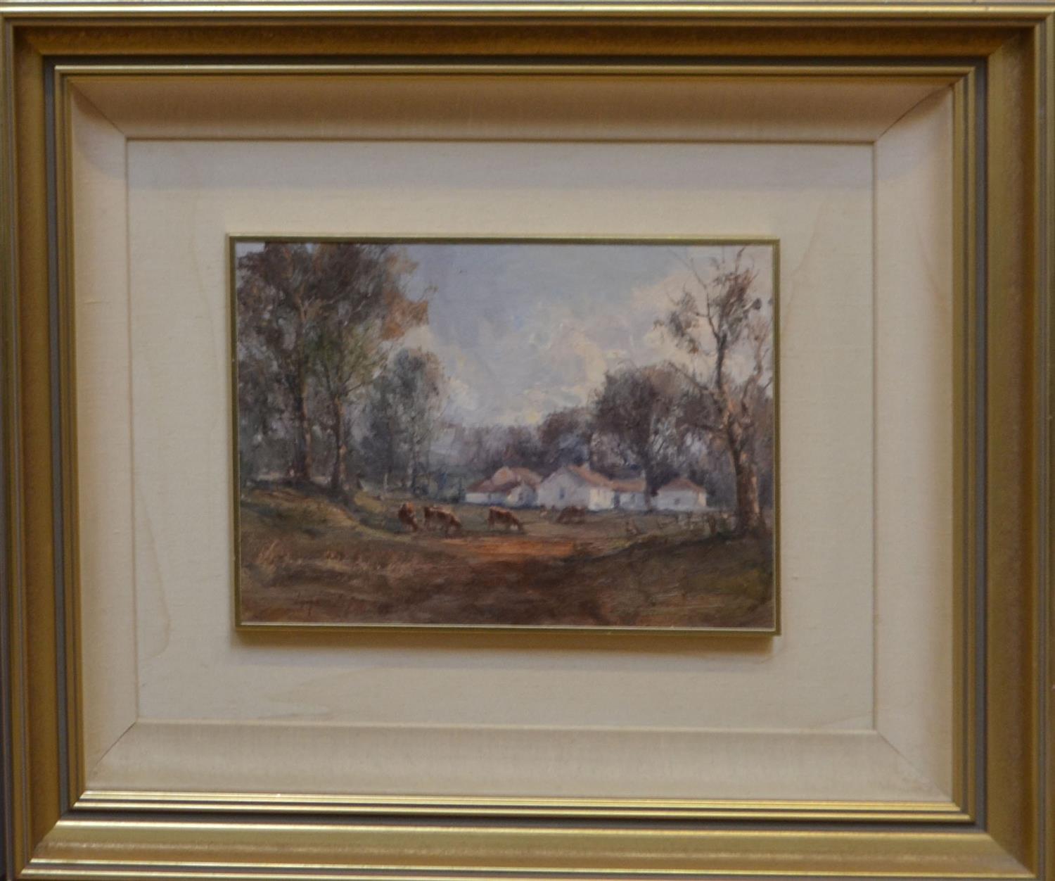 JOHN TIPLADY, 'SCOTNEY'S FARM', OIL ON BOARD, 22 X 30CM, FRAME SIZE: 53 X 61CM, CONDITION: VERY GOOD, WATER DAMAGE TO MOUNT