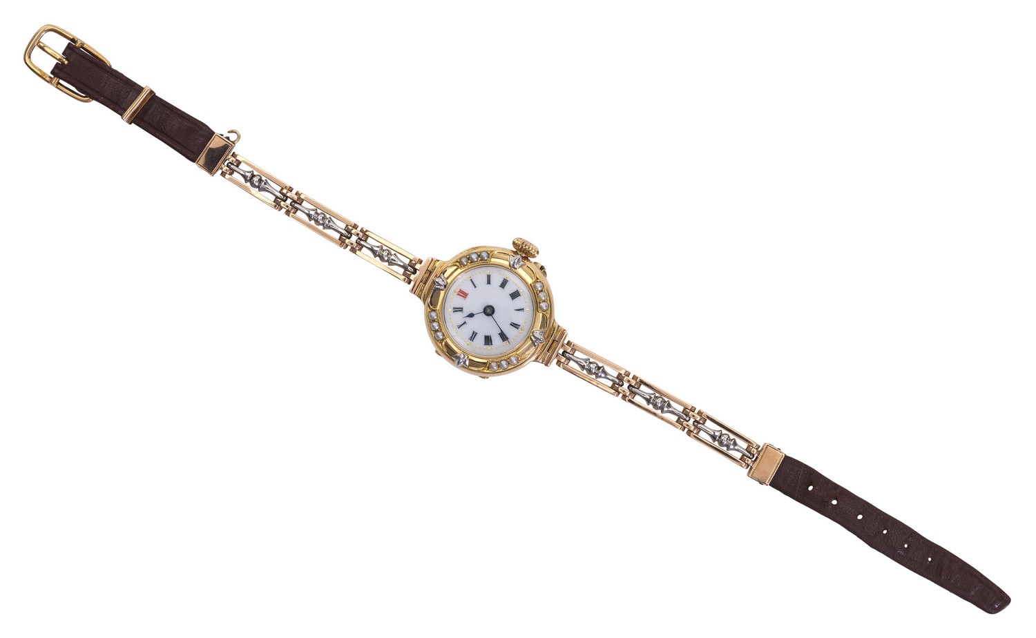 Manual wind, circular white dial with black and red Roman numerals, seed pearl set bezel, to articulated bands in two tone 15ct gold and leather terminals, diameter 25mm, boxed.