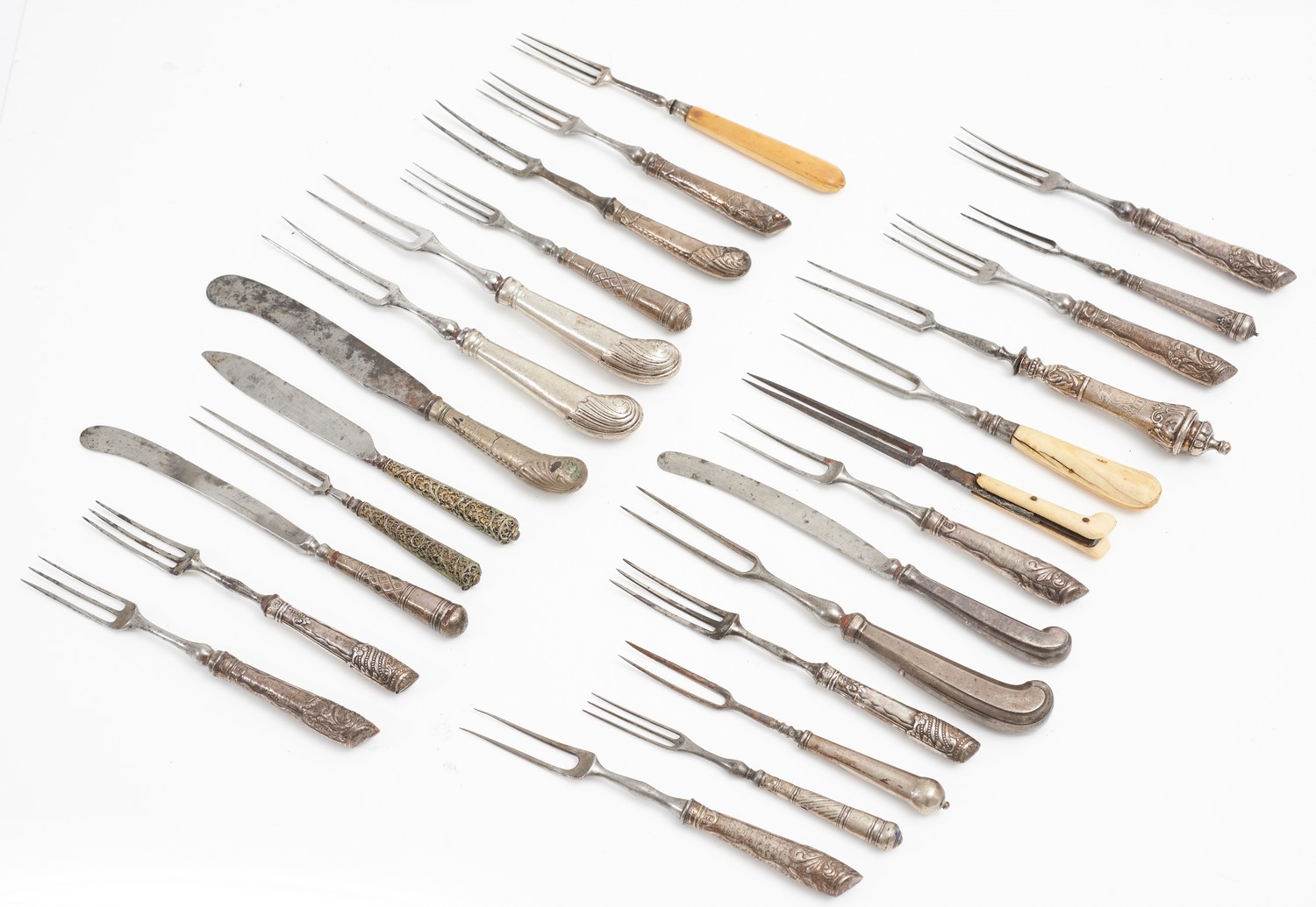 Comprising ten three-prong forks, eleven two-prong forks and four knives, of various styles and sizes.