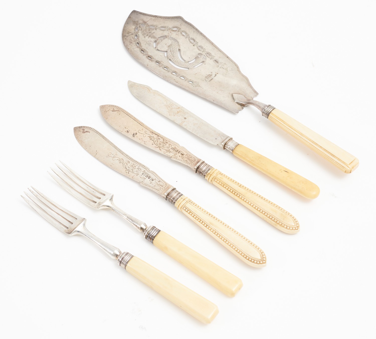 Comprising a set of six forks, hallmarked William Abdy II, circa 1790, a set of six Victorian fish knives with beaded detail to handles, hallmarked Harrison Brothers & Howson, Sheffield, circa 1868, a set of six fish knives hallmarked London, circa 1899, and a Georgian fish slice, hallmarked Peter and William Bateman, London, circa 1805.