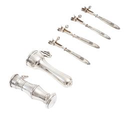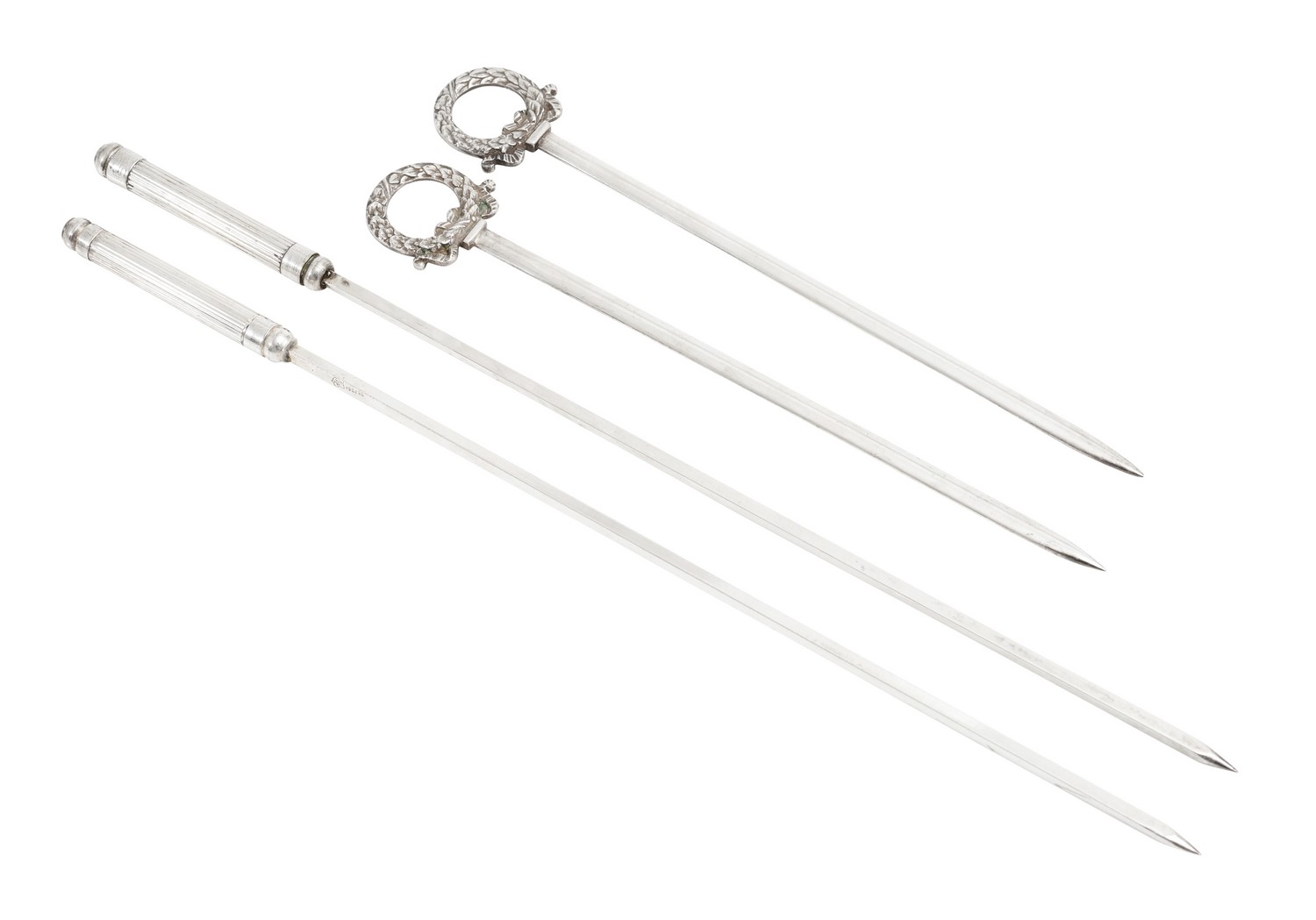 Comprising a set of four french silver bone handles, two silver plate bone handles (one by John Gilbert), a set of twelve French meat skewers, and another set of four meat skewers with wreath handles.