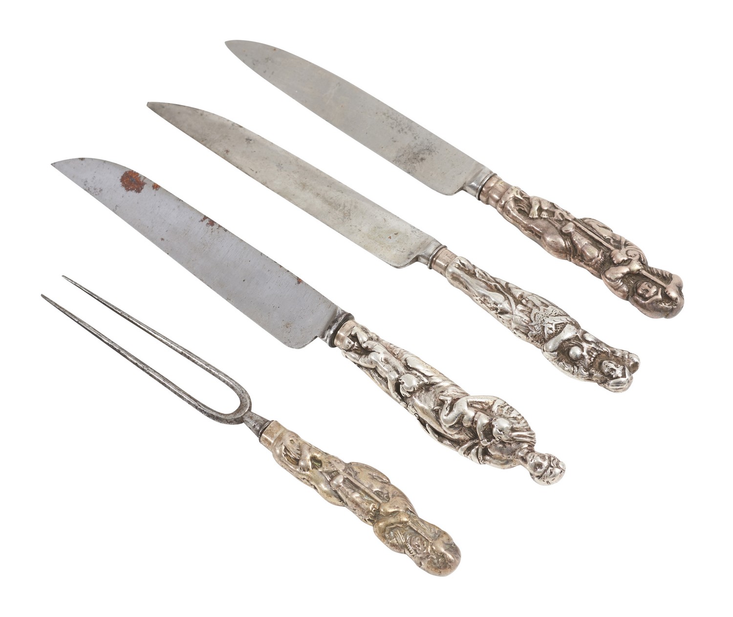 Comprising three knives and a two-prong fork, each with silvered handles adorned with classical style figures.