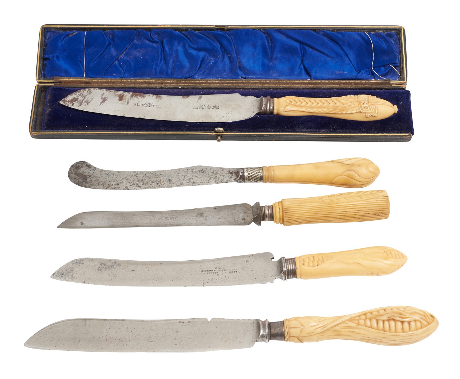 All knives have some rust, minor dents to blades, and dirt embedded in carved handles. Two knives have hair line cracks to the ivory. The cover has become separated from the box.