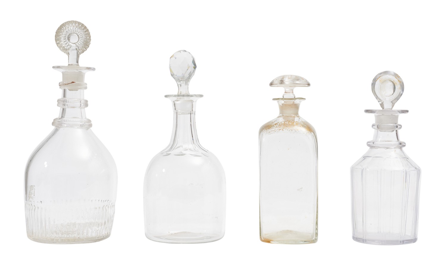 Comprising a Regency decanter of mallet form, with a triple ring neck, a 19th century mallet-form decanter with faceted detail to neck and stopper, a Georgian square section decanter with gilded decoration and a Regency mallet form decanter with a double ring neck and lozenge form stopper.