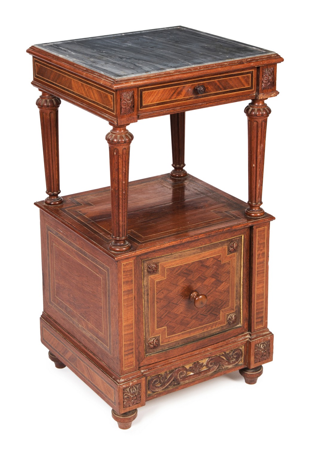 Having a square marble top with moulded edges, with a single drawer raised on four fluted columns above a single parquetry door applied with patera, opening to a marble lined cupboard, raised on turned feet