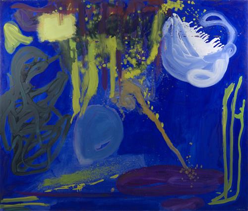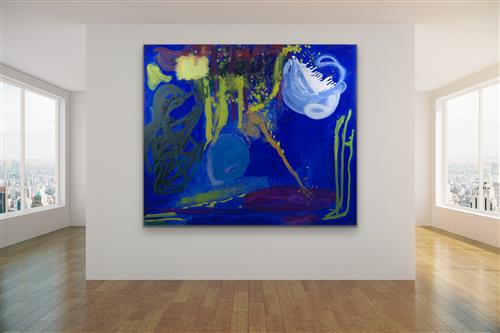 Good condition overall. The painting has likely had contact with a white surface and therefore white foreign pigment can also been seen on these edges. The work is stretched with no additional framing.